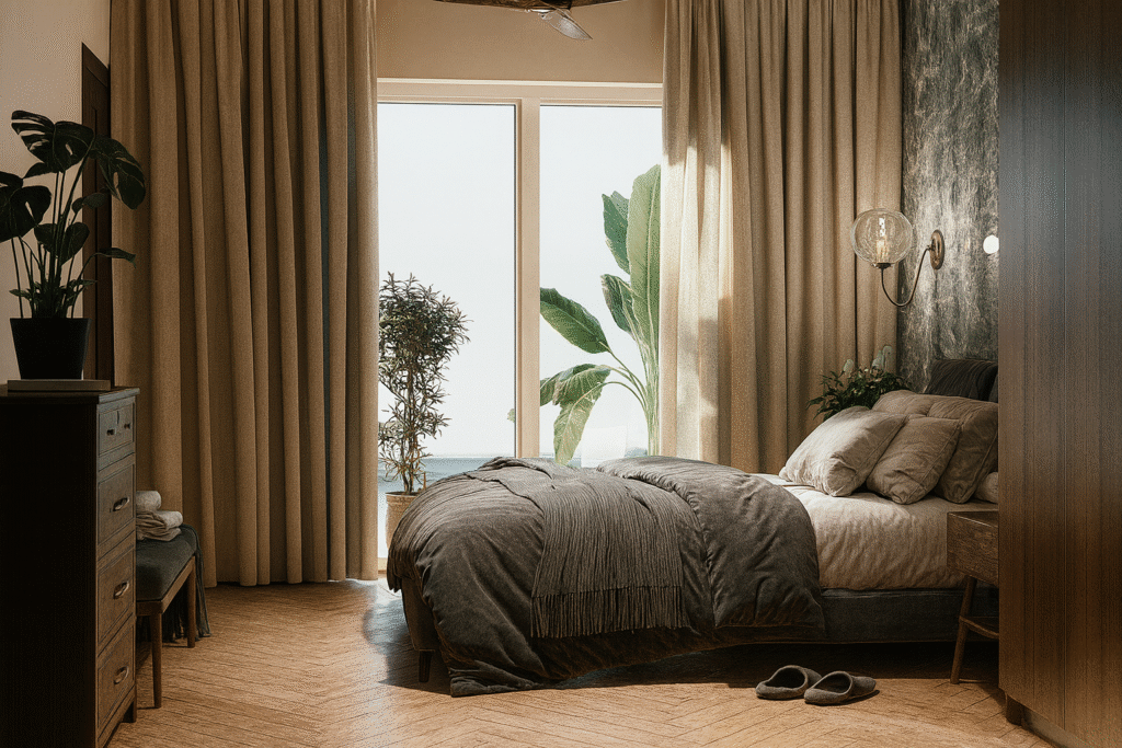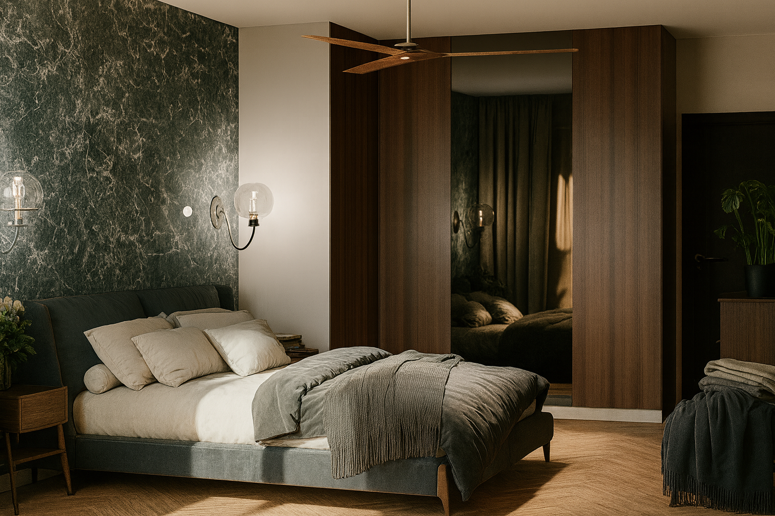 Sypialnia zaprojektowana jako harmonijna oaza — z wyrazistą ścianą inspirowaną marmurem, miękkimi tkaninami i naturalnym światłem, które podkreśla jej elegancki, przytulny charakter.