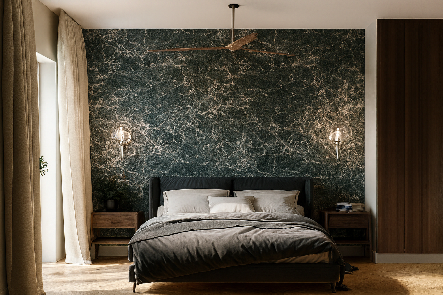 Nowoczesna sypialnia, w której marmurowy akcent i naturalne materiały tworzą atmosferę spokoju i subtelnego luksusu.