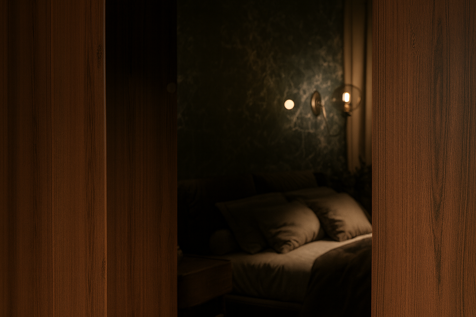 Ta sypialnia to połączenie spokojnej, wyciszonej estetyki z akcentem głębokiego, morskiego błękitu o marmurowym rysunku. Miękkie faktury, ciepłe drewno i subtelne oświetlenie tworzą atmosferę sprzyjającą odpoczynkowi, a całość pozostaje elegancka i ponadczasowa. Projekt buduje komfortową przestrzeń, która łączy funkcjonalność z delikatnym luksusem — idealnym do codziennego relaksu.