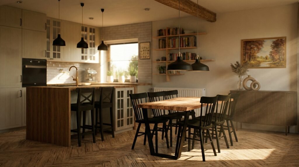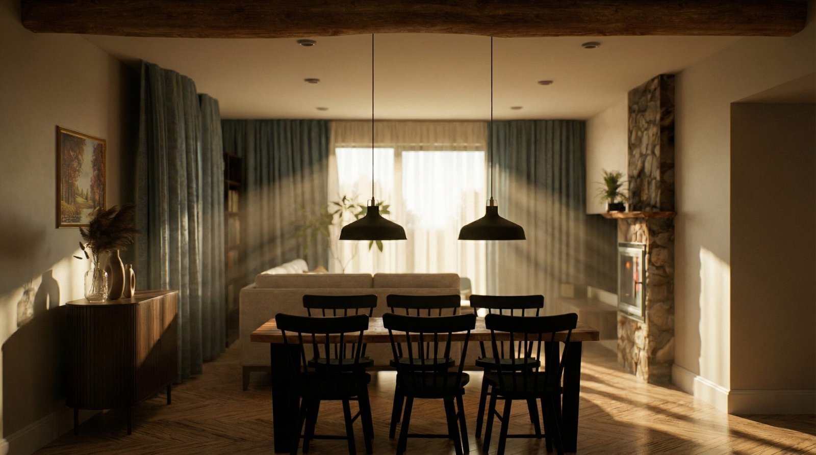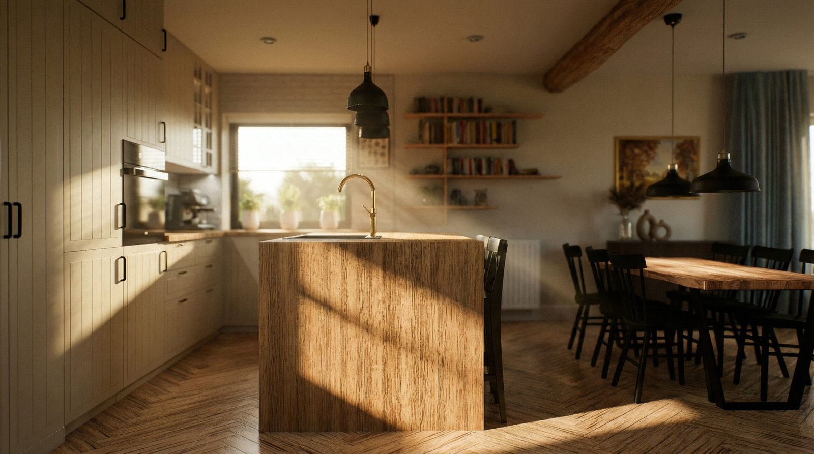 Przestrzeń, w której naturalne światło, ciepłe drewno i miękkie kolory tworzą atmosferę codziennego komfortu i ponadczasowej harmonii.